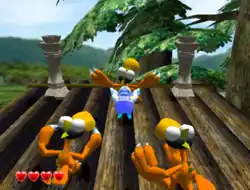 Wario can attack enemies in a variety of ways. Alongside basic punches, Wario can grab enemies and either spin them around, throw them, or piledrive them into the ground.[5][3] Wario can also grab certain items from the environment, allowing him to deal more damage and have a wider range in his attacks. If Wario is hit by an enemy, he loses a heart from his health bar. When all of Wario's hearts are depleted the player loses coins; when all coins are lost the game is over.[6] Wario can obtain more hearts by collecting pieces of golden statues resembling himself.