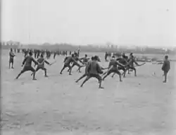 To defend themselves from the attacks of the warlord factions and armies, peasants organized themselves into militant secret societies and village associations which served as self-defense militias as well as vigilante groups. As the peasants usually had neither money for guns nor military training, these secret societies relied on martial arts, self-made weapons such as swords and spears, as well as the staunch belief in protective magic.[55][56] The latter was especially important, as the conviction of invulnerability was "a powerful weapon for bolstering the resolve of people who possessed few alternative resources with which to defend their meager holdings".[57] Magical rituals practiced by the peasants ranged from rather simple ones, such as swallowing charms,[58] to much more elaborate practices. For example, elements of the Red Spear Society performed secret ceremonies to confer invulnerability from bullets to channel the power of Qi and went into battle naked with supposedly bulletproof red clay smeared over their bodies.[24] The Mourning Clothes Society would perform three kowtows and weep loudly before each battle.[58] There were also all-female self-defense groups, such as the Iron Gate Society[24] or the Flower Basket Society.[58] The former would dress entirely in white (the color of death in China) and waved fans that they believed would deflect gunfire,[24] while the latter fought with a sword and a magical basket to catch their opponents' bullets.[58] Disappointed with the Republic of China and despairing due to the warlords deprivations, many peasant secret societies adopted millenarian beliefs,[57] and advocated the restoration of the monarchy, led by the old Ming dynasty. The past was widely romanticized, and many believed that a Ming emperor would bring a "reign of happiness and justice for all".[59][60]