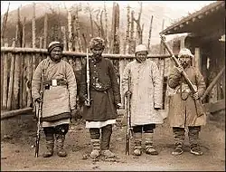 White Russian mercenaries defeated Muslim Uighurs in melee fighting when Uighurs tried to take Ürümqi on 21 February 1933 in the Battle of Ürümqi (1933).[49] Wu Aitchen mentioned that 600 Uyghurs were slaughtered in a battle by White Russian mercenaries in the service of the Xinjiang clique warlord Jin Shuren.[50][51] Jin Shuren would take Russian women as hostages to force their husbands to serve as his mercenaries.[52]