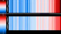 Warming stripes (sometimes referred to as climate stripes,[3][4][5][Note 1] climate timelines[6] or stripe graphics[7]) are data visualization graphics that use a series of coloured stripes chronologically ordered to visually portray long-term temperature trends.[2][Note 2] Warming stripes reflect a "minimalist"[2][5] style, conceived to use colour alone to avoid technical distractions to intuitively convey global warming trends to non-scientists.[8][9]