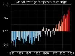 22. ^ Data source: "Met Office Climate Dashboard / Global temperature / Global surface temperatures / (scroll down to) Berkeley Earth". Met Office (U.K.). January 2024. Archived from the original on 2024-01-17. Data has been vertically offset to center trace vertically in chart.