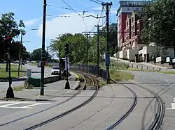 Streetcar service began when the section from Packards Corner to Chestnut Hill Avenue opened on May 26, 1900, connecting previously opened trackage to the east and west.[1][2] The trackage was not in a center median (as were the earlier sections), but in a reservation between the southbound travel lane and southbound carriage lane. Between Warren Street and Wallingford Road to the southwest, the reservation was significantly wider than the tracks.[4] In 1960, new southbound travel lanes were built along that section; southbound traffic now crosses the B branch tracks at Warren Street.