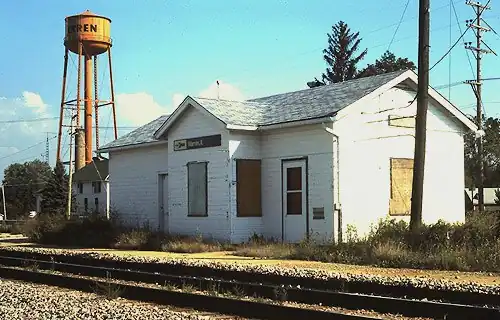 Warren is a former Amtrak railroad station in the city of Warren, Jo Daviess County, Illinois, United States. Located at the intersection of Railroad Street and Burnett Avenue in Warren, the station served the Black Hawk from February 13, 1974, to September 30, 1981.[4] The station consisted of one side platform with a depot, which has since been demolished. Prior to Amtrak, the station served trains operated by the Illinois Central Railroad, which began service on January 9, 1854, when service was extended 25 miles (40 km) northwest from Freeport.[1] Service continued until April 30, 1971, when the Hawkeye (Waterloo–Chicago) was discontinued on the day before Amtrak began passenger service.[3]