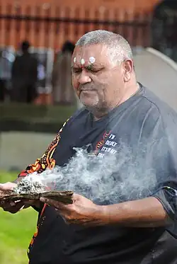 Ngarrindjeri elder Mark Koolmatrie performing a traditional ceremony for Warrulan, using smoke from burning bunches of native South Australian Rosemary