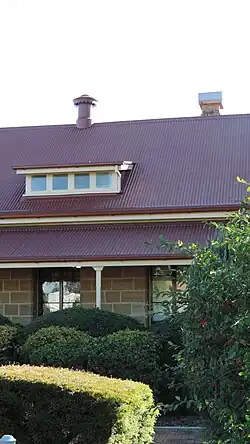 The eastern, principal, elevation features a projecting gable with two narrow lancet windows with a small arched window above them and a centrally positioned circular air vent. A similar arrangement of vent and lancet windows is found at the western gabled end of the building. On the northern and southern gable ends there are sets of three narrow lancet windows. Above each set is a small arched window. The eastern elevation has five large square windows to both northern and southern wings on either side of the projecting gabled entry porch. On both sides of each wing are open verandahs. The southwestern section is enclosed and incorporates a timber extension now used as a tuck shop.[1]