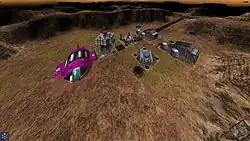 All of the terrain throughout the campaign is essentially composed of three areas, with different sectors for Away missions and other such levels; upon progression, previous maps simply expand and the player's original bases from past levels are maintained. Also, its resource system is quite different from mainstream RTS games; Oil Derricks are established over specific, scarce locations which constantly provide a slow, fixed rate of income. Combined with a mission time limit, this resource method makes it generally infeasible for players to utilize certain traditional RTS tactics such as "turtling" (fortifying one or more bases against enemy attack, while stockpiling resources with which to produce a massive army).
