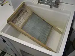 Many parts of the world still use washboards for washing clothes.[3] Clothes are soaked in hot soapy water in a washtub or sink, then squeezed and rubbed against the ridged surface of the washboard to force the cleansing fluid through the cloth to carry away dirt. Washboards may also be used for washing in a river, with or without soap. Then the clothes are rinsed. The rubbing has a similar effect to beating the clothes and household linen on rocks, an ancient method, but is less abrasive. Military personnel often use washboards to do their laundry when no local laundry facilities exist.[4]