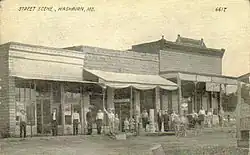 Following the establishment of the railroad and the growth of the former O’Day community, many businesses were established in what is now Washburn. Among these were the O’Day House Hotel, Felker & Johnson's mercantile, the Pratt or Cunningham grocery store, J. M. Holton's mercantile, Denbo's grocery, the Brookshire & Chandler drug store, and W. B. Adcock's drug store. Many of these businesses had previously been located in the old Keetsville site, but moved to take advantage of the railroad. The O’Day Globe newspaper was founded in 1887. That same year, Irishman Timothy Patrick Mooney (1833-1912) moved his store and warehouse there from Washburn. In 1887 Reece Brothers built a large store and Postmaster James Buchanan Hurst (1859-1934) a post-office building.[7]
