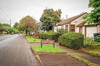 The Washburne Historic District in Springfield, Oregon was established in 1985 and added to the National Register of Historic Places (NRHP) in 1987. The district includes 29 full blocks and five partial blocks, and it is roughly bounded by A Street on the south, G Street on the north, Pioneer Parkway on the west, and 10th Street on the east. Its total area encompasses 84 acres.