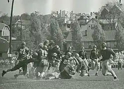 One of the best games in W&J football history came on November 4, 1922, against the Lafayette Maroons in front of 50,000 spectators at the Polo Grounds in New York City.[28] The Red and Black were down 13–0 at halftime before a Pruner West-sparked comeback won the game 14–13 on a final play to Herb Kopf.[28] In 1923, W&J defeated the powerful Brown University at College Park, the first time home victory against an Ivy League team.[28] Neale left to coach at University of Virginia and was replaced by legendary coach John Heisman, who stayed for only one season before moving to coach at Rice University.[5] During the season Heisman coached, W&J beat the previously undefeated West Virginia Mountaineers.[29] Andy Kerr's teams from 1926 to 1928 continued to play and defeat the best teams in the country.[28] In 1930, W&J defeated Lafayette College 7–0 in the first ever college indoor night game, held in front of 20,000 spectators in Atlantic City.[30]