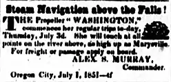 - ^ a b c d e Schnebly, D.J., ed. (July 3, 1851). "The Washington, Capt. Murray owner, leaving Oregon City on Thursday last …". Oregon Spectator. Vol. 5, no. 43. Oregon City, O.T.: Robert Moore. p. 2 col. 1.