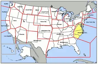 WaADS was established in December 1956 as the 4625th Air Defense Wing.[1] It was not assigned any units until 1958 when it assumed control of former ADC Eastern Air Defense Force units primarily in Maryland, Delaware, and Virginia.[2] Units of the 32d Air Division in North and South Carolina were transferred to WaADS in 1961 as the 26th Air Division area of responsibility expanded southward.[3] The organization provided command and control over several aircraft, missile and radar squadrons.