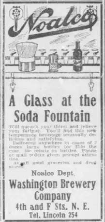 On April 23, 1909, the company launched a competition to name a new non-alcoholic drink for a prize of $100 in gold. The contest was announced on April 23 in an advertisement in the Evening Star by Harry Williams, General Manager of the brewery. The requirement was that the name be short, catchy, appropriate, and easily remembered. The closure of the submissions was set to May 3.[22] On October 19, 1909, an advertisement in the Washington Times revealed the new name: Noalco. This product responded to the Temperance movement calling for non-alcoholic beverages. The drink was dispensed at soda fountains and was said to "quench your thirst and relieve your fatigue". It was also available in a case of 24 large bottles for delivery for $2, and in grocery and drug stores, individual bottles cost 5 cents and 10 cents.[23] It was made of brewed malt and hops, yet was non-alcoholic.[24] From November 8 to November 20, 1909, the National Food Show and Industrial Exposition opened in Convention Hall off of K Street NW. According to articles in the press, their samples were given out to visitors and very well received.[25][26]