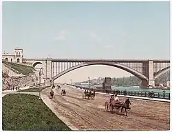At the western end of the Washington Bridge, there are ramps to and from the Trans-Manhattan Expressway, carrying Interstate 95 and U.S. Route 9. The approach viaduct crosses Harlem River Drive, which runs along the western shore of the Harlem River. The bridge's main roadway continues west to the intersection of 181st Street and Amsterdam Avenue (formerly Tenth Avenue), adjacent to Highbridge Park.[7] The distance between the end of the masonry approach and the intersection with Amsterdam Avenue is 200 feet (61 m).[18][28] The intersection is 27 feet (8.2 m) higher than the bridge deck, necessitating a 3.5 percent upward slope.[10] The entrance to the northern sidewalk is in McNally Plaza, slightly northeast of the intersection of 181st Street and Amsterdam Avenue.[39] The entrance to the southern sidewalk is from the southeastern corner of the intersection.[7]