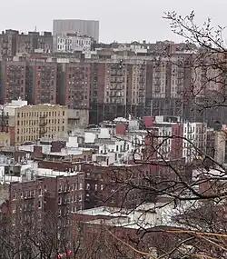 The southern and eastern parts of Washington Heights experienced a construction boom in the years leading up to World War I.[35]: 77 The downtown access provided by the IRT prompted a rapid increase in density through the proliferation of five- and six-story New Law Tenements, the vast majority of which remain.[39] Many of the new residents came from crowded immigrant neighborhoods such as the Lower East Side,[38]: 15 which saw its density halved between 1910 and 1930.[40]: 73 As a result of the development of new housing, the total population of Manhattan north of 155th Street grew from just 8,000 in 1900 to 110,000 by 1920.[40]: 53 The incoming residents of Washington Heights were a diverse group of people of European descent. In 1920, nearly half were Protestant, most of whom had parents born in the United States; the remainder was split between Jews and Catholics, typically immigrants or born to immigrant parents.[40]: 292
