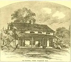 At the northwest corner of 181st Street and Broadway (then Kingsbridge Road) was the Blue Bell Tavern, built in the early-mid 18th century as an inn and site of social gatherings.[12]: 65 [20]: 331 When New York's Provincial Congress assented to the Declaration of Independence on July 9, 1776, the head of the statue of George III ended up on a spike at the Blue Bell Tavern, broken off by a "rowdy" group of civilians and soldiers at Bowling Green.[9]: 232