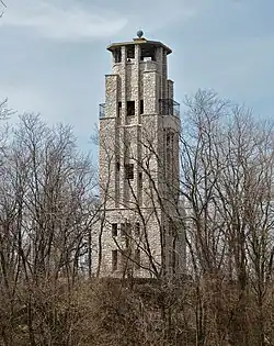An observation tower east of the zoo that overlooks the lake, and the "castle" that houses small mammals followed by 1937. The tower is a creation of a steel faced with limestone and the roof is topped with a spherical ornament reported to be a compression chamber from the city's first fire engine.[4]