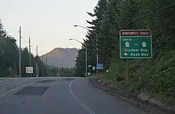 SSH 9A was later renumbered to SR 112 in 1964 under the new sign route (now state route) system.[24] In a 1971 study, the Washington State Department of Highways recommended that Burnt Mountain Road be re-added to the state highway system as SR 111, but it remained under county control.[25][26] The state legislature approved the restoration of the corridor to the state highway system in 1991, assigning SR 113 to it.[27] The SR 113 designation had been created in 1964 for the Discovery Bay–Coupeville highway,[24][28] which was replaced by SR 20 in 1973.[26][29]