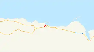 SR 117 begins as the Tumwater Truck Road at an interchange with U.S. Route 101 (US 101) in southwest Port Angeles. The interchange only serves traffic from US 101 eastbound driving onto SR 117 northbound and motorists driving from the route southbound onto US 101 westbound, however, left turns are allowed to serve the missing movements.[4] Traveling north, the highway intersects Lauridsen Boulevard and crosses under 8th Street. Between 8th Street and the Port Angeles waterfront, a daily average of 7,400 motorists accessed the roadway in 2008.[5] After the 8th Street bridge, the road intersects 3rd Street and terminates at Marine Drive, which continues east as 1st Street to US 101.[6][7]