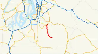SR 165 begins at the western boundary of Mount Rainier National Park on Mowich Lake Road, which continues east for 6 miles (9.7 km) to a campground at Mowich Lake on the northwestern flank of Mount Rainier.[2] Mowich Lake Road is open seasonally from July to October, remaining closed to vehicular traffic during the winter and spring due to weather conditions.[3][4] The southernmost section of the highway is an unpaved gravel road—the only one to be included in Washington's state highway system.[5]