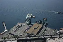 The northern terminus of SR 519 at Colman Dock (Pier 52) on the Central Waterfront of Seattle viewed from the Columbia Center