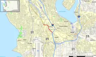 SR 599 is 1.75 miles (2.82 km) long and travels on a four-lane freeway located entirely within the city of Tukwila in suburban King County.[1] It begins at a Y interchange with I-5 near Foster Memorial Park, approximately 1.4 miles (2.3 km) north of the Southcenter Mall and the terminus of Interstate 405. The interchange lacks connections to the north side of I-5, which are provided by the parallel Interurban Avenue, and has a direct offramp to the high-occupancy vehicle lanes on southbound I-5.[2] The only intermediate junction on SR 599 is a partial cloverleaf interchange at South 133rd Street near several office parks, including the headquarters of BECU.[3][4]