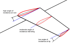 The reverse twist (higher incidence at wingtip), wash-in, can also be found in some designs though less common. The Grumman X-29 had strong wash-in to compensate for the additional root-first stalling promoted by the forward sweep.