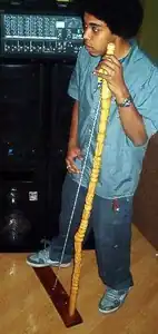 Ethnomusicologists trace the origins of the instrument to the 'ground bow' or 'ground harp' – a version that uses a piece of bark or an animal skin stretched over a pit as a resonator. The ang-bindi made by the Baka people of the Congo is but one example of this instrument found among tribal societies in Africa and Southeast Asia, and it lends its name to the generic term inbindi for all related instruments. Evolution of design, including the use of more portable resonators, has led to many variations, such as the dan bau (Vietnam) and gopichand (India), and more recently, the "electric one-string", which amplifies the sound using a pickup.