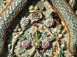 The central prang is topped with a seven-pronged trident, referred to by many sources as the "Trident of Shiva".[17] Around the base of the prang are various figures of ancient Chinese soldiers and animals. Over the second terrace are four statues of the Hindu god Indra riding on Erawan.[18] In Buddhist iconography, the central prang is considered to have three symbolic levels—base for Traiphum indicating all realms of existence, middle for Tavatimsa, the Tusita Heaven where all desires are gratified, and the top denoting Devaphum indicating six heavens within seven realms of happiness.[18] At the riverside are six pavilions (sala) in the Chinese style. The pavilions are made of green granite and contain landing bridges.