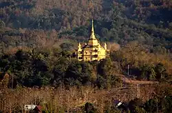 Wat Pa Phon Phao, also Wat Phon Phao, Wat Phonphao, or Wat Phol Phao, meaning "Peacefulness Temple",[1] is a Buddhist temple situated on a hill in the southeast of Luang Prabang, Laos, across the Nam Khan River from Luang Prabang Airport.[2] The temple, a golden stupa,[3] is used as a forest meditation retreat, and was once headed by the abbot Ajahn Saisamut, a noted Lao Buddhist teacher.[4] His funeral in 1992 was one of the largest funeral services Laos had ever seen. The temple has a fine collection of murals, some of them gruesome in nature.