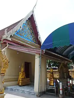 Wat Pak Nam Fang Nuea is smaller than Wat Pak Nam Fang Tai. The ordination hall is small in Mon style, facing east, with a single door without windows, known locally as mhaaud (มหาอุด). The principal Buddha image in the posture of meditation is called Luang Phor Petch (หลวงพ่อเพชร).[1]