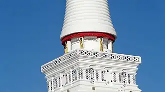Historians believe that the city was almost emptied by epidemics and war, prompting the king to build a larger stupa in the Sri Lankan-style with public participation and thereby re-develop the town community. The other religious buildings were constructed between the 13th and 18th centuries including the Wihan-Bodhi Lanka, a roofed cloister around the bodhi tree which is believed to be a sprout of the Mahabodhi tree in the Mahabodhi Temple in Bodh Gaya, India.[1][6]