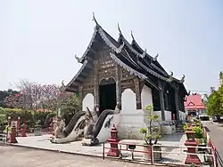 The wooden assembly hall built in 1823 is fine example of the La Na architectural style. The pediment above the main entrance is filled with wooden carvings of various motifs and two nagas are positioned on either side of the steps.[1][2][3][4]