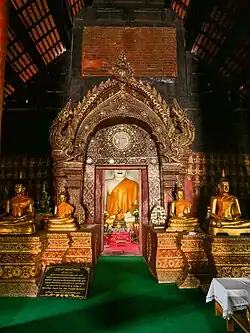 An unusual feature of the interior is its rare configuration with the principal Buddha sitting in a small chamber (Ku Lai), which is joined to a small pagoda situated outside with a square base and niches for Buddha images. Found only in the Chiang Mai school of craftsmen, it was believed that this arrangement allowed the Buddha to practice meditation in peace and solitude. The entrance to the alcove is highly decorated with bas-relief motifs and coloured glass, and on either side are smaller Buddha images of stucco, and one of bronze in the Maravijaya attitude, referred to as Phra Chao Muen Thong, which has inscribed on its base the date of its casting in 1590. Two rows of parallel columns support the roof, and its walls have murals that are thought to date back to the 1820s. The temple also has a second assembly hall and a chedi of recent origin.[1][2][3][4][5]
