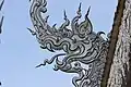The principal building, the ubosot, is an all-white building with fragments of mirrored glass embedded in its exterior. It embodies design elements from classic Thai architecture, such as the three-tiered roof and abundant use of Nāga serpents.[5] "Inside the temple, the decor swiftly moves from pristine white to fiery and bewildering. Murals depict swirling orange flames and demon faces, interspersed with Western idols such as Michael Jackson, Neo from The Matrix, Freddy Krueger, and a T-800 series Terminator. Images of nuclear warfare, terrorist attacks such as the World Trade Center attack, and oil pumps hammer home the destructive impact that humans have had on earth. The presence of Harry Potter, Superman, and Hello Kitty confuses the message somewhat, but the overall moral is clear: people are wicked.[8]