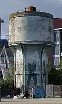 The Water Tower has a large cylindrical tank supported on six concrete ribs around the base. The panels of the tower (between the ribs) are infilled with brick. It has an access door on the southeast side and internal stairs.[1] The tower was built at the same time as the railway station buildings, to serve the station's fish platform.[1] At 15 m (50 ft) in height, it was completed in 1932 and painted in brown and beige, the livery colours of the Great Western Railway.[2]