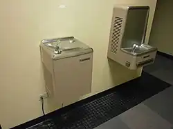 Newer variants of water coolers include an additional dispenser designed to fill water bottles directly on wall-mounted units. This is increasingly common in public water coolers as they have also been spotted in public places such as airports[6][7] and railway stations.[8] These bottle filling units also can indicate the number of single-use plastic bottles saved as part of an ongoing public effort to reduce plastic pollution.