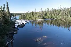 The river basin lies between the basins of the Véronique River to the west and the Little Watshishou River to the east.[5] The river basin contains the Nabisipi River Old Forest (Forêt ancienne de la Rivière Nabisipi) and the Lake Davy Old Forest (Forêt ancienne du Lac Davy).[6] In the last 15 kilometres (9.3 mi) none of the land of the coastal region exceeds 150 metres (490 ft) in elevation. The terrain is fairly smooth, sloping gently down to the Gulf of Saint Lawrence. To the east of Watshishou Harbor the Morne Watshishou stands out at over 60 metres (200 ft).[7]