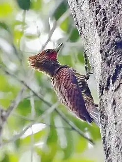 The waved woodpecker has a complicated taxonomic history. For much of the past it was assigned three subspecies. A 2011 publication suggested that the four subspecies of the scaly-breasted woodpecker (then C. grammicus) properly belonged as subspecies of the waved woodpecker, and a 2018 publication provided further evidence.[7][8] In 2019 BirdLife International's Handbook of the Birds of the World (HBW) lumped the scaly-breasted woodpecker's four subspecies into the waved woodpecker to join its existing three subspecies.[9] In July 2023 the International Ornithological Committee (IOC) followed suit.[3] The Clements taxonomy lumped them in late 2023 as did the South American Classification Committee of the American Ornithological Society in late 2024.[10][2]