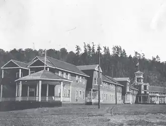 Built in 1908, the Wawa hotel was a wooden structure consisting of a three-story centre block flanked by a pair of two story wings. The centre block was capped by a five-story tower featuring a powerful electric searchlight (a novelty at the time) and housed the main rotunda and a dining room with capacity for 300 people. The wings had rooms on two floors, with the entire hotel having a total 153 rooms. The accommodations were considered luxurious at the time, with hot and cold running water in every room, electric light throughout the hotel, and many rooms featuring en suite bathrooms. The rooms, the majority of which were 4.3 m x 4.9 m (14 feet x 16 feet), were said to be larger than average for similar summer hotels. Numerous activities were available to the guests, such as sailing, canoeing, swimming, tennis, baseball, football, bowls and quoits.[2]
