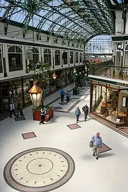 The design of the building is typically Victorian, with a domed and barrel-vaulted glass roof, supported by decorative iron work, with some stained glass windows and mahogany shop fronts that have been virtually unaltered since the day the arcade opened. There are at least thirty shops which are spread over two floors in the arcade.[3] The upper shopping level features balconies that stretches the majority of the building's length, which can be accessed from three staircases in the arcade.
