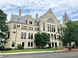 The Wayne County Courthouse is a historic courthouse located in Richmond, Wayne County, Indiana. It was built during the period 1890–93, and is in the Richardsonian Romanesque style. The building was designed by Cincinnati, Ohio, architect James W. McLaughlin and the construction was supervised by New Castle, Indiana, architect William S. Kaufman. The U-shaped building measures approximately 214 feet by 128 feet, and is constructed of brick faced with Indiana Limestone. It features a projecting entrance pavilion, high pitched hipped and gable roofs, large semicircular arches, and octagonal corner tower.[2] Architectural historians Michael Tomlan and Mary Raddant-Tomlan have suggested that the Wayne County Courthouse was influenced both in terms of exterior design and elements of interior layout by Henry Hobson Richardson's Allegheny County Courthouse in Pittsburgh, Pennsylvania.