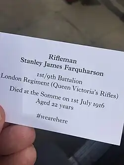 Throughout the day, some 1,600 volunteers, all men, dressed in replica British army uniforms of World War I, appeared in groups at railway stations, shopping centres and other places.[1][4] Each volunteer represented an individual, named, soldier who died on the first day of the battle.[1] When approached, they did not speak, but instead handed cards to members of the public, bearing the name, age and regiment of the person they represented, and the hashtag #wearehere.[1] Deller described these cards as "like small tombstones".[4] From time to time, the volunteers would sing the recursive refrain "We're Here Because We're Here..." to the tune of Auld Lang Syne, as sung in the trenches before the battle.[1]