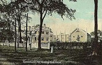 Once called the "most photographed house in the state" of Maine,[1] the Wedding Cake House, known formally as the George W. Bourne House, is a historic house located at 104 Summer Street in Kennebunk, Maine. The home was built in 1825 by shipbuilder George W. Bourne (1801–1856), who later built a frame barn which he connected to the main house with a carriage house. In 1852, the barn caught fire and the carriage house was demolished to keep the fire from spreading to the house. Bourne, who during a European tour had been impressed by the Gothic beauty of the cathedral at Milan, rebuilt the carriage house and barn in what later came to be known as Carpenter Gothic style. Using hand tools, he crafted five buttresses with pinnacles on top of each. Then in order to tie the new structures in with the existing house, he added six buttresses with pinnacles to the house and then joined them together with intricate woodwork. His only help in doing this was Thomas Durrell, an apprentice ship's carpenter. Bourne spent the rest of his life adding to these embellishments.[2] It has been said of Bourne: "The highly skilled carpenter knew no limits to his skill."[3]