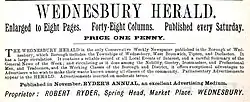 The Wednesbury Herald was a weekly newspaper published in the Municipal Borough of Wednesbury, England, during the Victorian era. It billed itself as the only conservative paper published there. The publisher was Robert Ryder and an associated Ryder's Annual was published each November.[1][2] Microfilm copies of the paper are held by Sandwell Metropolitan Borough Council archives.[3]
