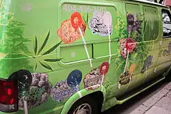 Weed World Candies sells lollipops. The lollipops are marketed and sold in vans across the United States. With advertising on the vans depicting cannabis plants next to lollipops, strong euphemism suggests a cannabis flavor or the possibility of intoxication after eating the lollipops. The candy sold from the vans does not contain THC.[1][2][3][4][5][6]