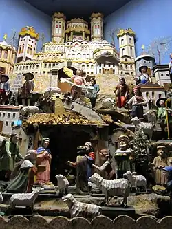 A Weihnachtsberg is a decorative, mountain-like model of the landscape of the Ore Mountains (between Germany and the Czech Republic), which is set up indoors during the Christmas period.[1] It portrays the nativity scene and mining motifs as well as local themes. The figures and objects are often movable and mechanically driven.