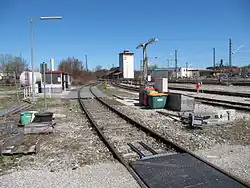 Due to its importance as a hub, Weilheim station had its own locomotive depot (Lokomotivstation), a branch of Bw München Hbf at Munich Central Station. The locomotive station was located to the west of the station and consisted of a three-stall roundhouse, a turntable and some sidings. Signal box 3 controlled the tracks of the locomotive depot. The locomotive station was closed in 1986 and the roundhouse and turntable were demolished.[5]