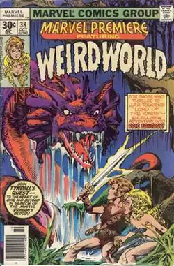 Originally intended to be published in the discontinued Monsters Unleashed, the first "Weirdworld" story eventually appeared in the one and only issue of the black-and-white magazine Marvel Super Action.[1][2] It then was featured in the color comic book Marvel Premiere #38 (October 1977).[3][4] In late 1977 or early 1978, co-creator Ploog left Marvel in a contract dispute while in the midst of drawing a 60-page "Weirdworld" story, written by Moench, that the company had planned to publish as one of its Marvel Comics Super Special series of one-shots. Ploog recalled in 1998 that he had "a disagreement with [editor-in-chief] Jim Shooter. I had moved to a farm in Minnesota, and agreed to do a hand-colored 'Weirdworld' story. Marvel backed out of the deal after I had started. I can't remember the details, but it doesn't matter. I think I was ready to move on. Marvel and I were both changing".[5] Rick Marschall, the story's editor, said in 1978 that Ploog had been given four months to complete the art, and when it became evident that the deadline would not be met, arranged to publish the story in two 30-page installments, giving Ploog two more months. Ploog sent Marvel photocopies of the first 31 pages, and was paid for them. During this time, Marvel had given work-for-hire contracts to its freelancers, many of whom, including Ploog, refused to sign, resulting in cessation of work for Marvel. Ploog "took himself off the project", said Marschall, and retained his original artwork.[6] Moench's script was eventually published as a 106-page story illustrated by penciler John Buscema, inker Rudy Nebres, and airbrush colorist Peter Ledger as the three-part "Warriors of the Shadow Realm" in Marvel Super Special #11–13 (Spring–Fall 1979).[7][8][9] Additional Weirdworld stories were published in several issues of Epic Illustrated in 1981 and 1982.[10][11][12][13]