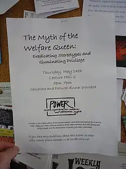 In the 1960s, black- and female-led movements for adequate welfare benefits and a resistance against negative stereotypes started to be seen throughout the United States in local and community contexts.[36] By organizing political demonstrations, creating welfare resource guides, advocating against restrictive welfare requirements (such as a disqualification for welfare benefits if there was an adult male figure in the household), and challenging the idea of a heteronormative, two-parent family structure being the gold standard for a functional and self-reliant household, these women (who referred to themselves as mothers to highlight the value of their labor at home) aimed to provide greater autonomy and reduce stigmatization for mother welfare-recipients.[36] They also argued against the control of female reproduction through welfare, that all women should have the choice whether or not to use birth control and that welfare support should not be contingent on how "deserving" the mothers were based on their choices.[36]